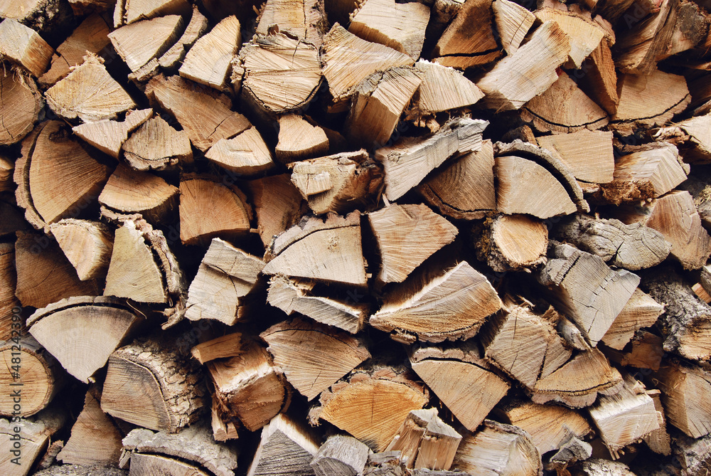Stacked chopped dried logs texture as background