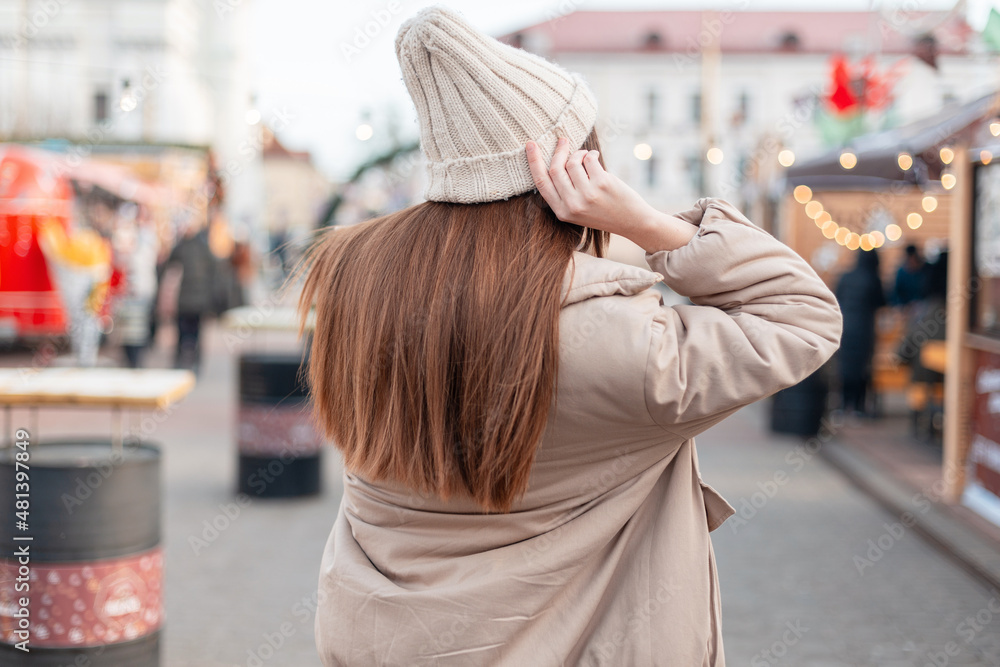 Stylish beautiful young girl in casual winter fashion outerwear with a knitted hat and jacket walks in the city fair