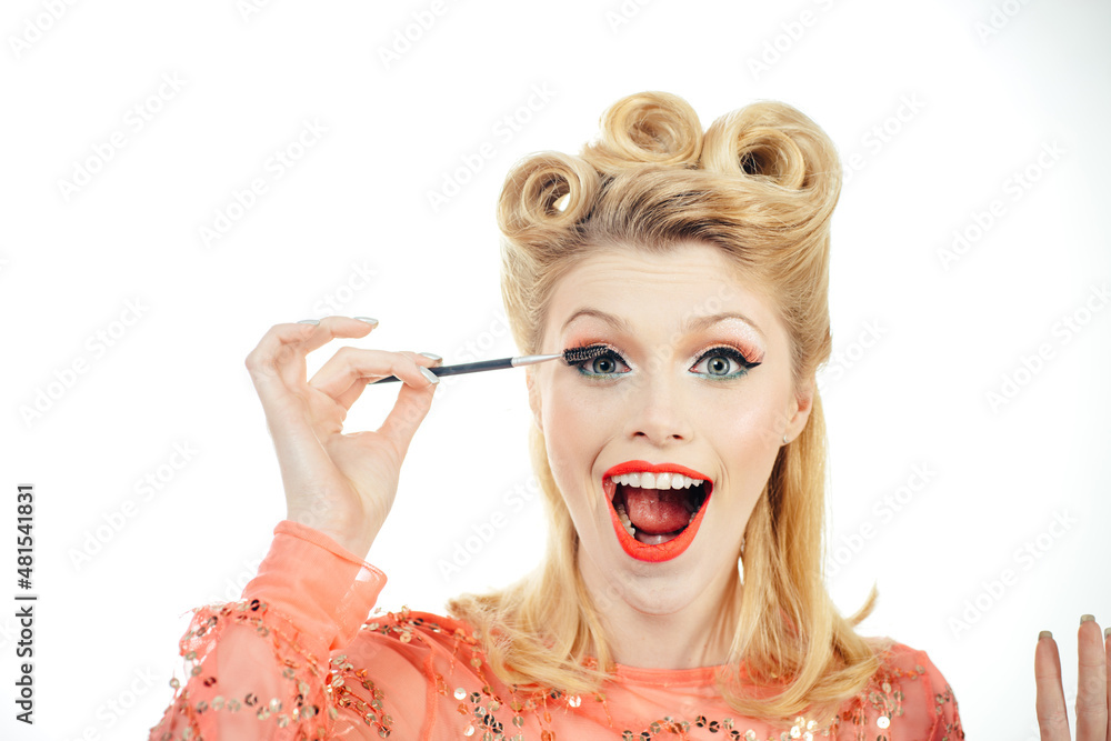 Eyebrow makeup. Blonde excited woman brushing brows with brows brush closeup. Pin up style.
