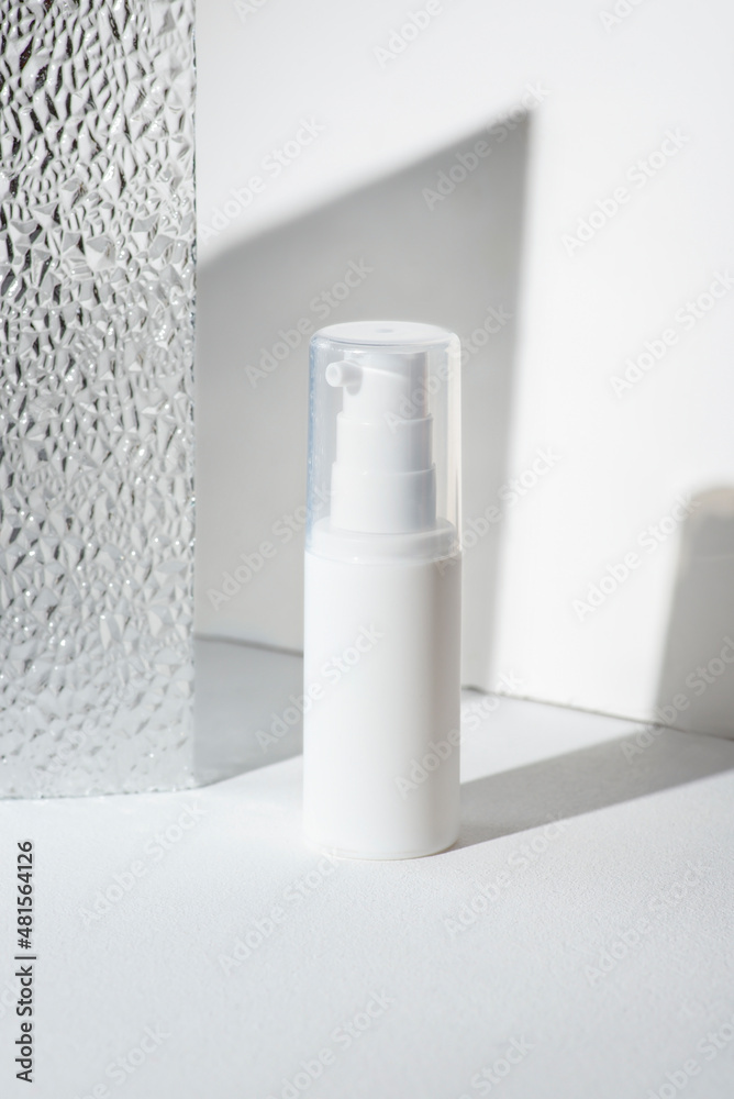Plastic white bottle with pump for cream or lotion against the background of corrugated glass. Skin care cosmetic on white background with shadow. Beauty concept for face care