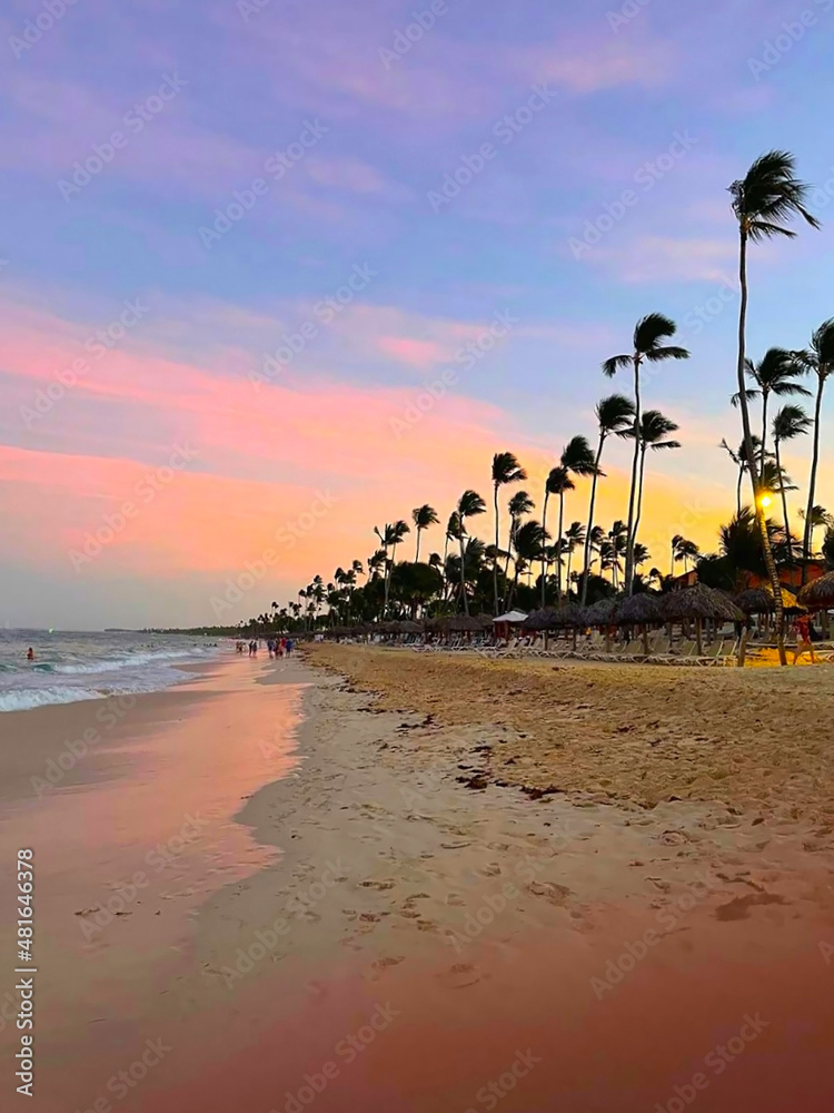 Beautiful sunrise over tropical beach and palm trees in Dominican republic