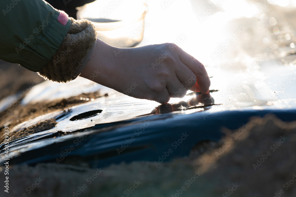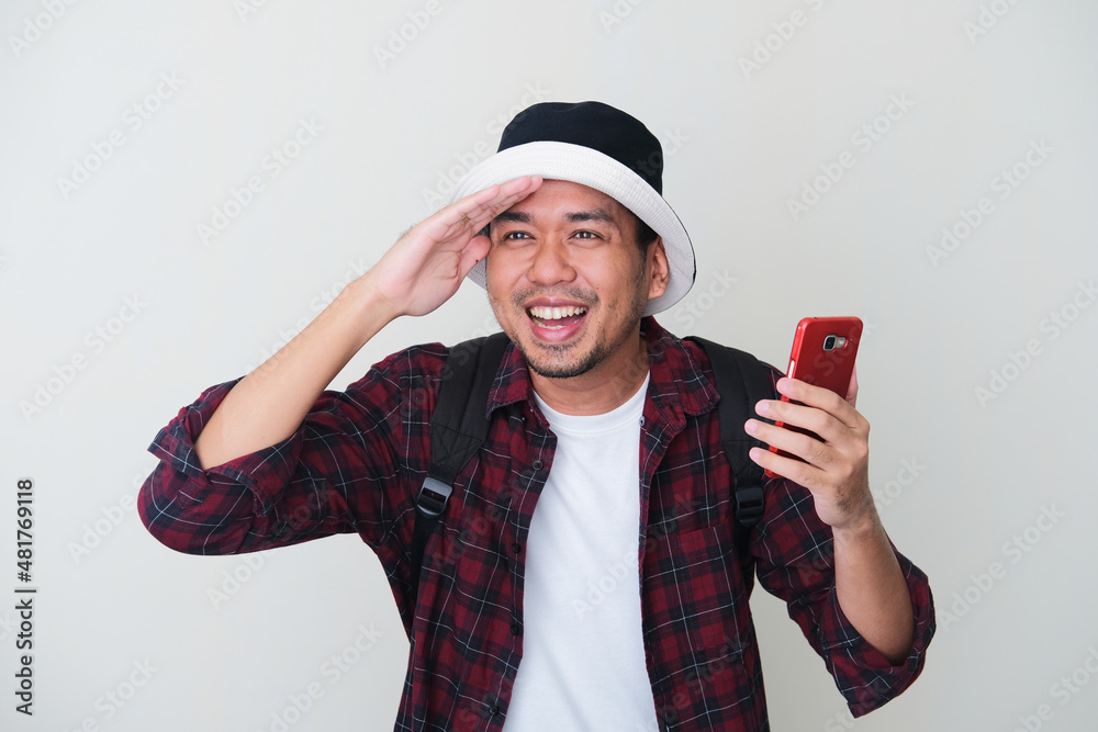 Adult Asian man wearing bucket hat and backpack smiling happy when looking far ahead, Travelling concept