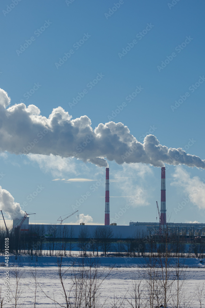 Winter landscape, snow-covered field and in the distance there are CHP chimneys on the horizon and smoke comes out of them.