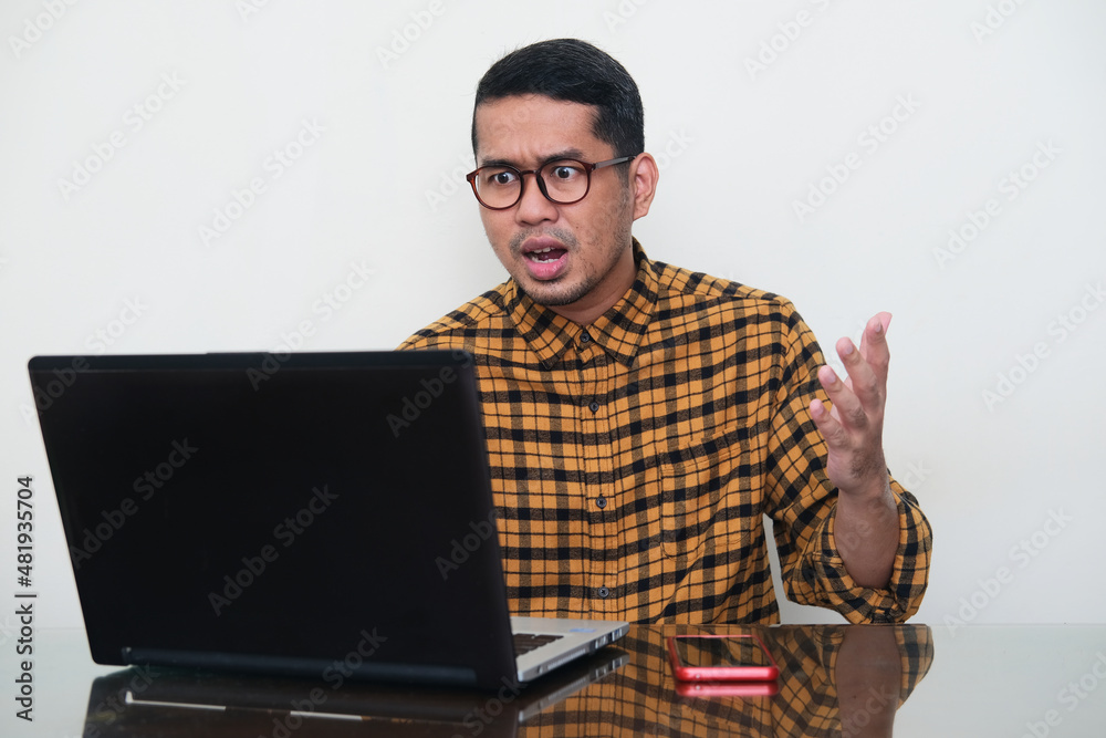 Adult Asian man showing disappointed expression while looking to his laptop.