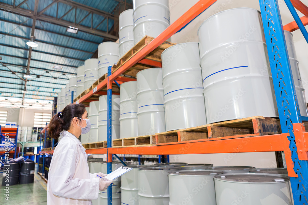 Employees inspecting industrial oil tanks in a warehouse, Infrastructure.