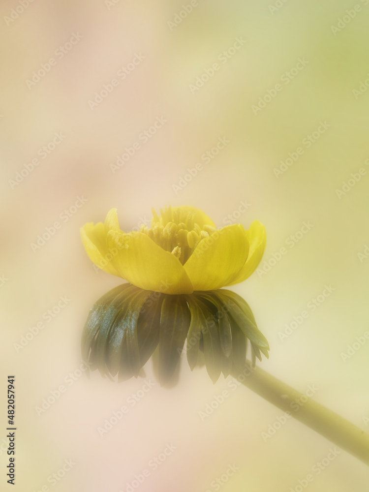 Closeup of single winter aconite (Eranthis hyemalis) against a diffused background