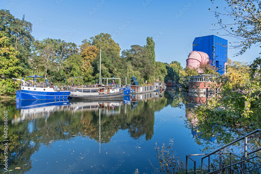 Landwehr Canal with boats and the pink tube in Berlin, Germany