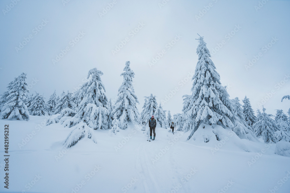 Mountaineer backcountry ski walking ski alpinist in the mountains. Ski touring in alpine landscape with snowy trees. Adventure winter sport.