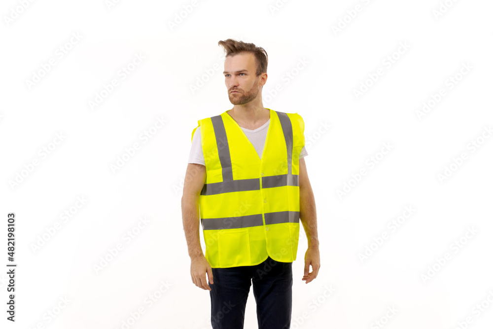 Adult man in uniform work vest standing on white background