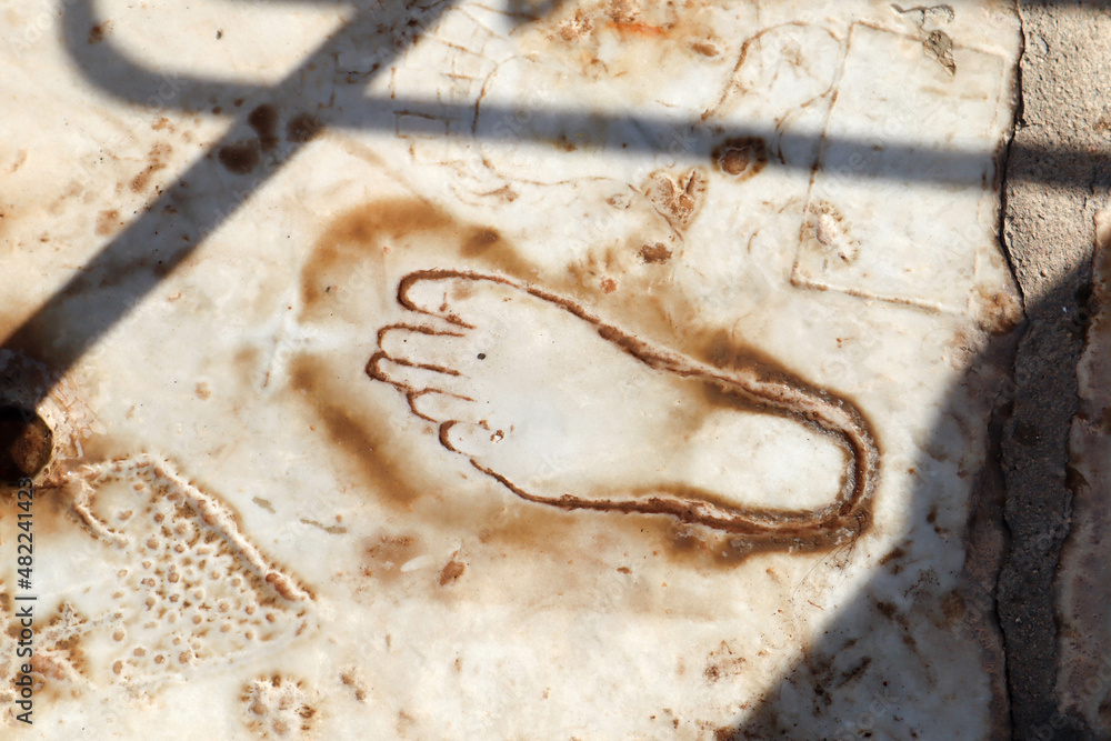 footprint carved in marble in ancient Ephesus city, Turkey that show to the whorehouse