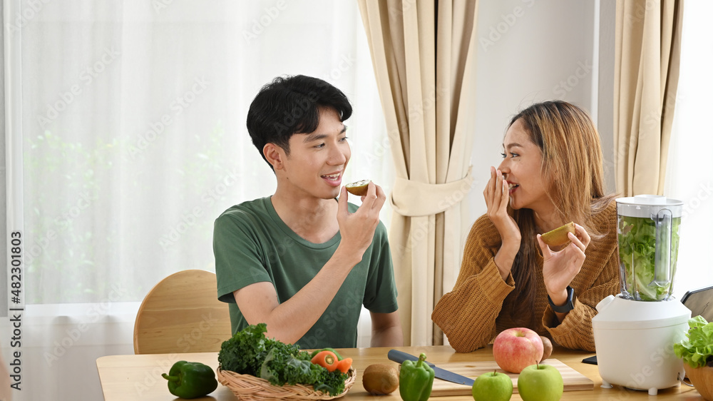 Happy young couple enjoying preparing green detox vegetable smoothie. Healthy lifestyle concept.