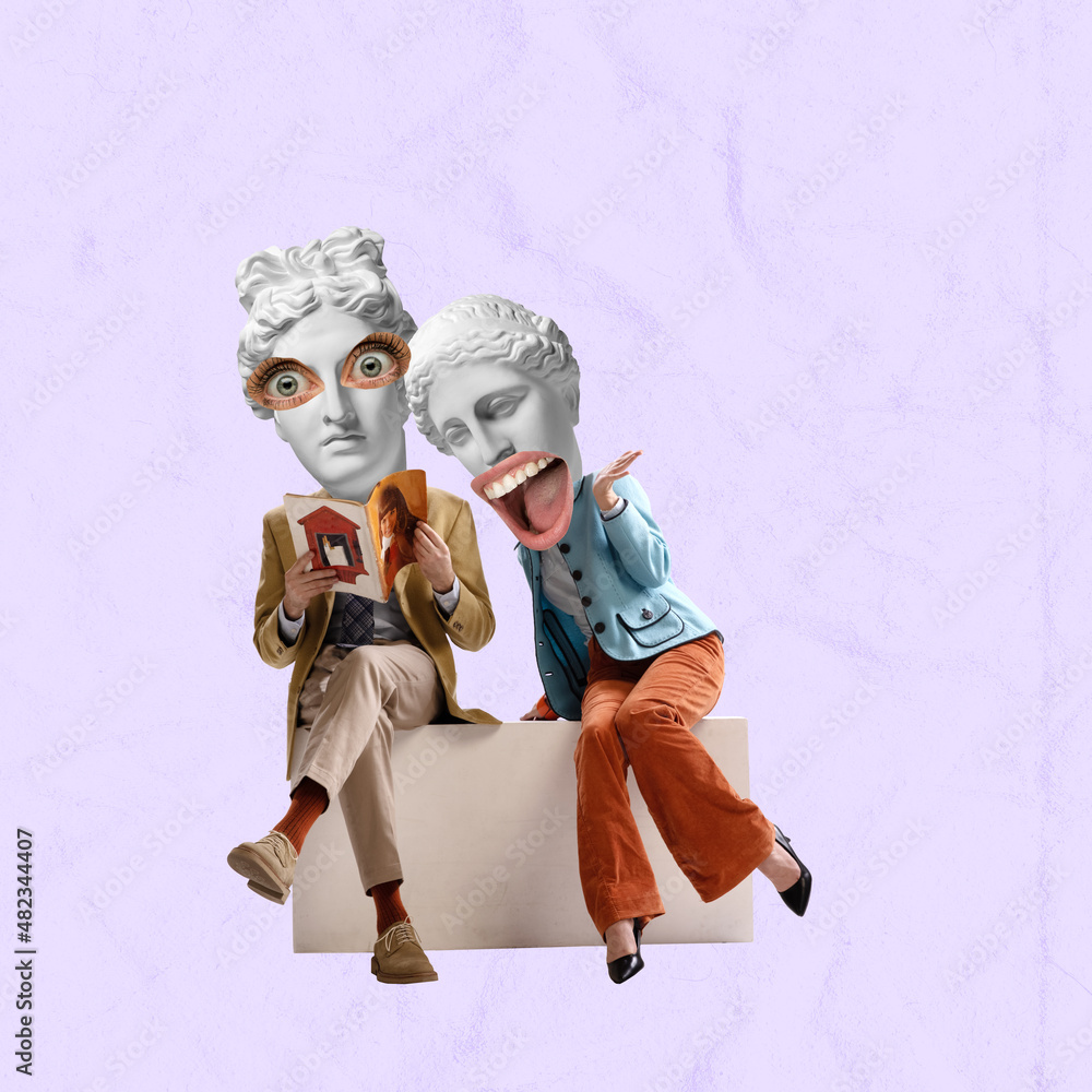 Modern design, contemporary art collage. Stylish couple headed with ancient statue heads reading magazine on light background