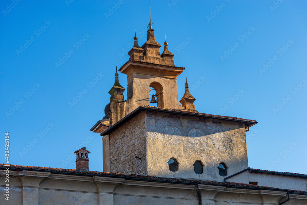 Bergamo upper town, close-up of the medieval Tower called Torre della Campanella (tower of the small bell) or Torre della Cittadella, Lombardy, Italy, Europe.