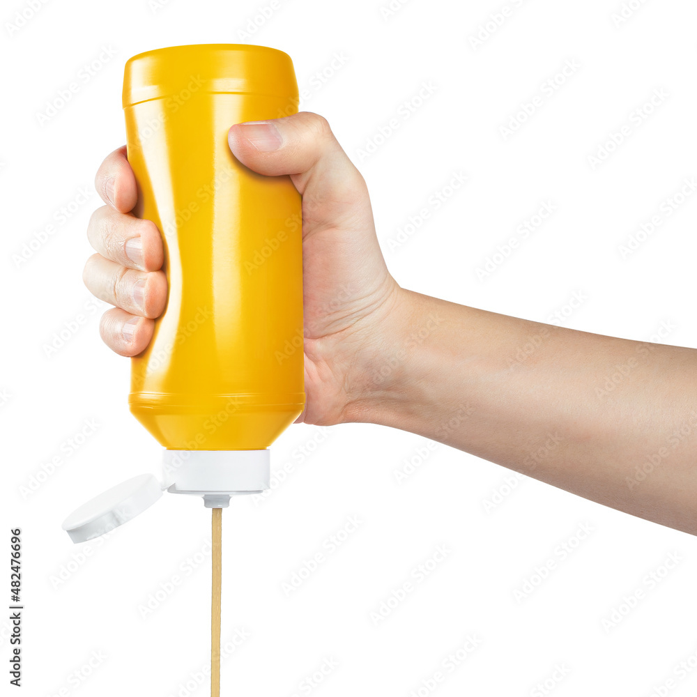 Hand squeezing mustard out of a plastic bottle, isolated on white background