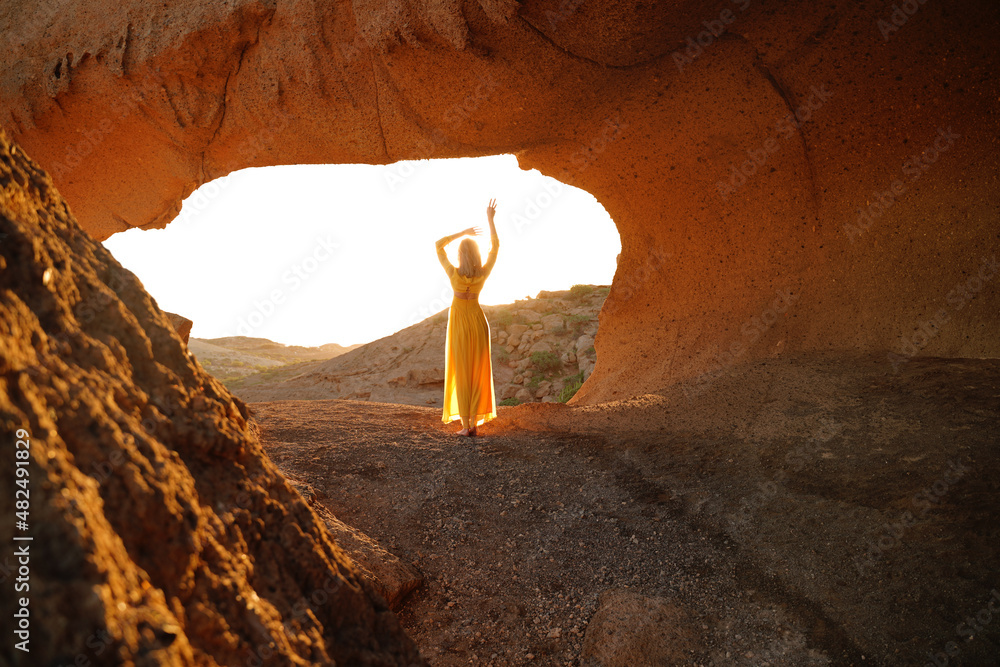 Woman in maxi yellow dress watching sunrise from the rocky cave in Tenerife, dancing, meditating. Back view.