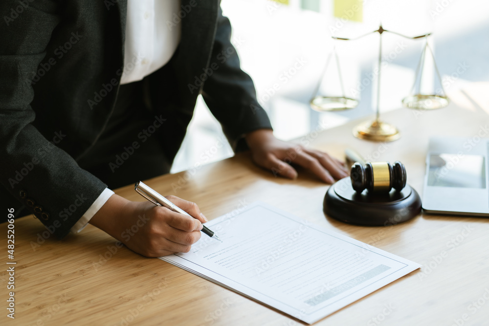 Judge gavel with Justice lawyers having team meeting at law firm background. Concepts of Law and Legal services.
