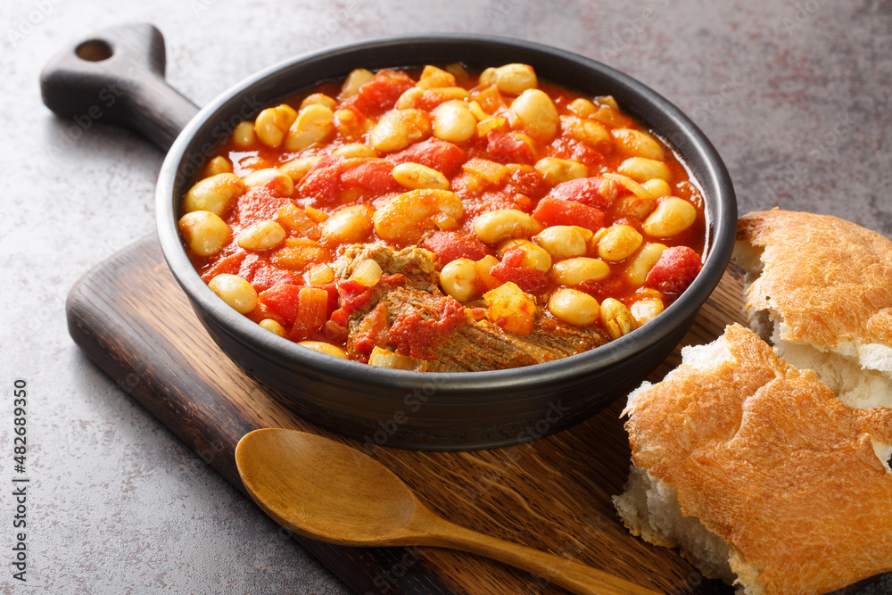 Moroccan loubia is a traditional dish consisting of stewed white beans closeup in the bowl on the wooden board. Horizontal