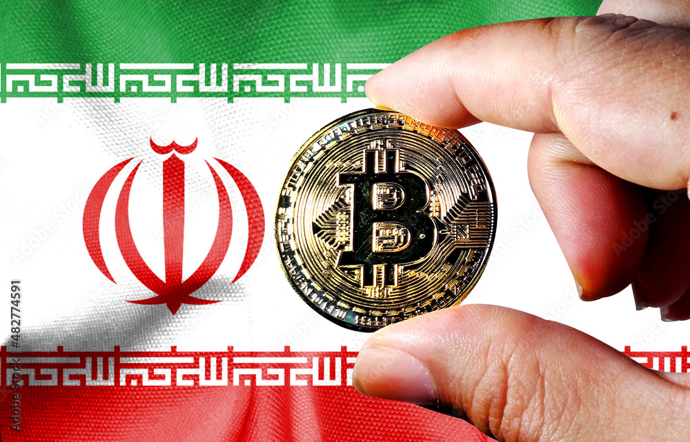 Holding a physical version of Bitcoin (the new virtual currency) and the Iranian flag . cryptocurrency and blockchain technology investor concept map