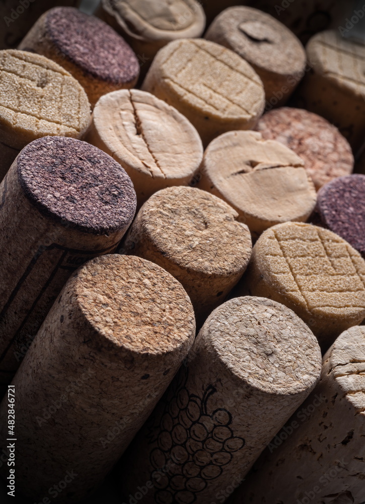 Closeup of used wine corks. A random selection of used wine corks. Vertical format that fills the frame