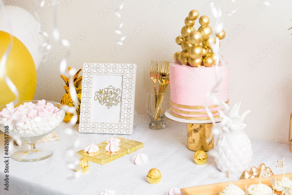 Holiday birthday table with cake and ballons. Pink and golden decoration