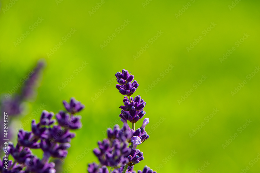 Purple lavender flowers on natural green background.