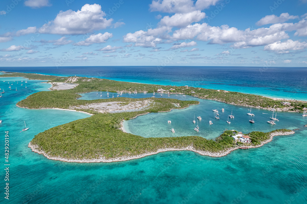 The drone aerial view of Stocking Island, Great Exuma, Bahamas.