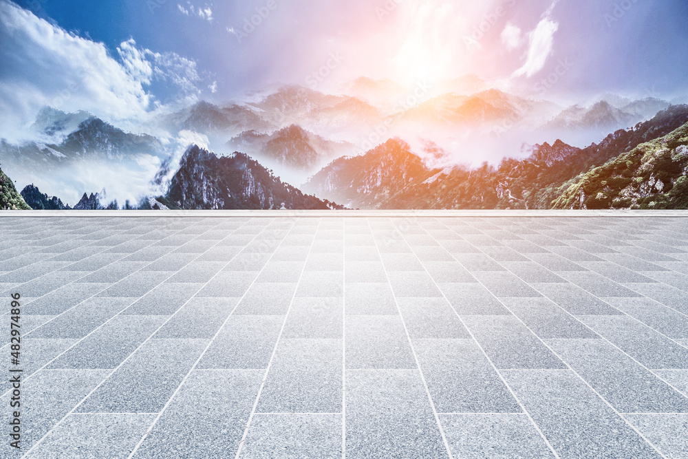 Uninhabited brick square and mountain skyline under blue sky