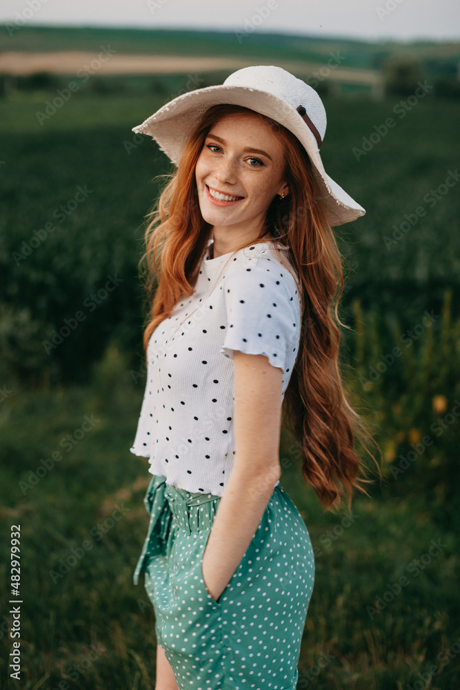 Outdoor photoshoot with a woman in hat standing against green field smiling, looking at camera. Modern lifestyle.