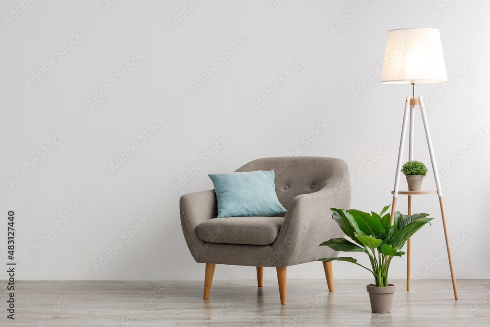 Comfort armchair with pillow, glowing lamp and potted plant on floor, on gray wall background