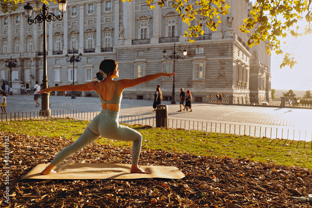 Young woman yoga outdoors at sunset in front of royal palace of Madrid