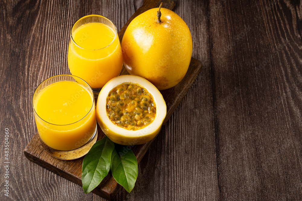 Glass with passion fruit juice and sliced passion fruit on the table.