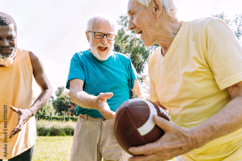 Group of senior friends playing at the park. Old multiethnic friends making activities outdoor. Concept about third age and lifestyle