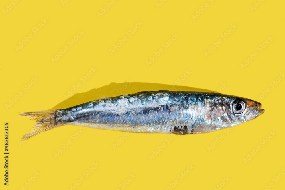 (Engraulis encrasicolus) Fresh silver-colored anchovies on a yellow background. Fish rich in vitamin B with an exquisite flavor