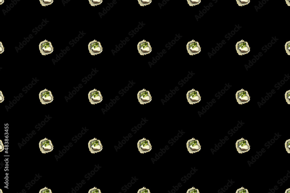 Colorful pattern of japanese sushi rolls on black background. Top view. Flat lay. Pop art design