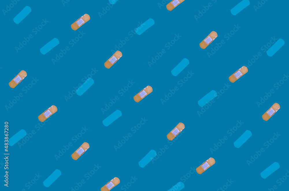 Colorful pattern of adhesive plasters on blue background. Top view. Flat lay. Pop art design
