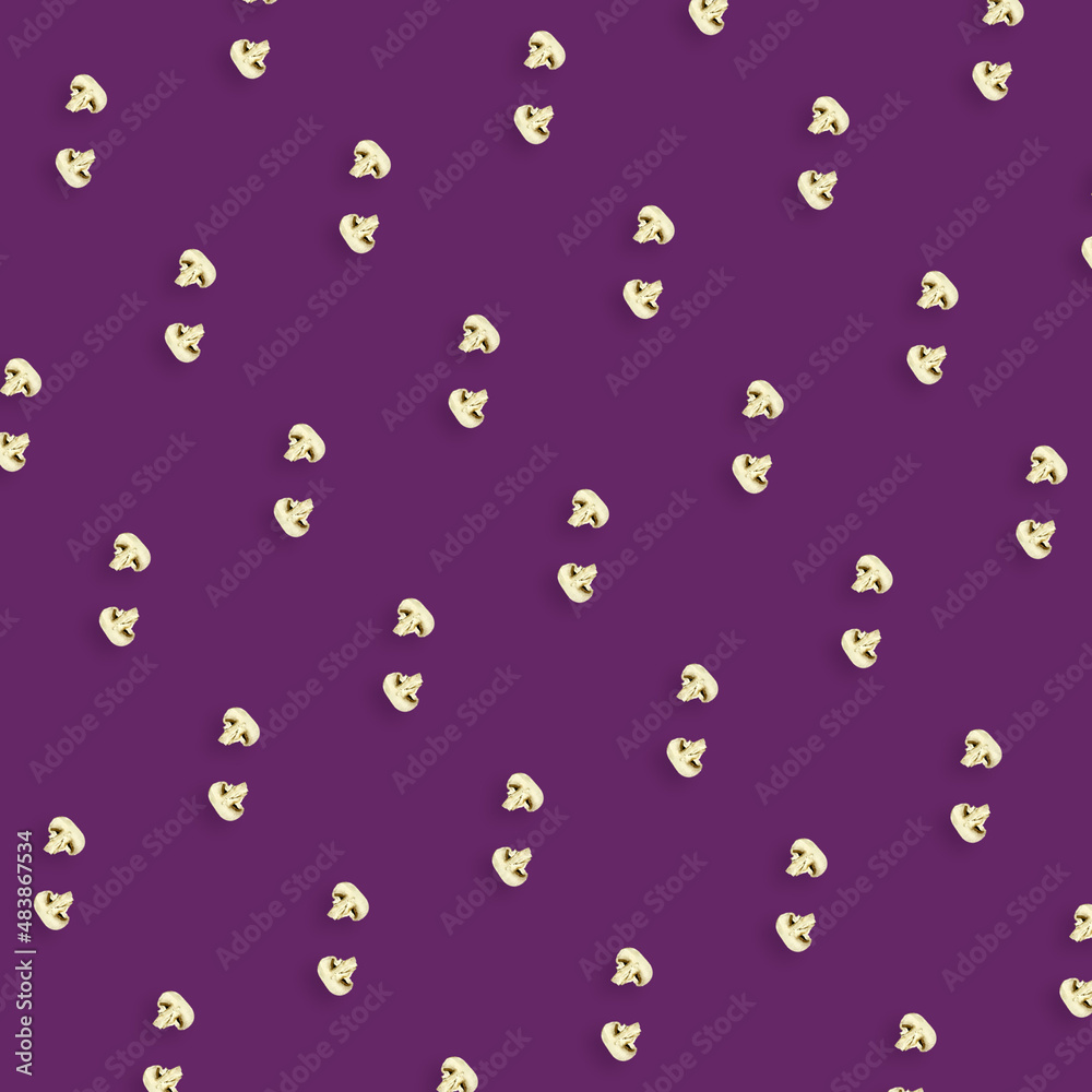 Colorful pattern of fresh mushrooms on violet background. Champignon sliced. Top view. Flat lay. Pop art design