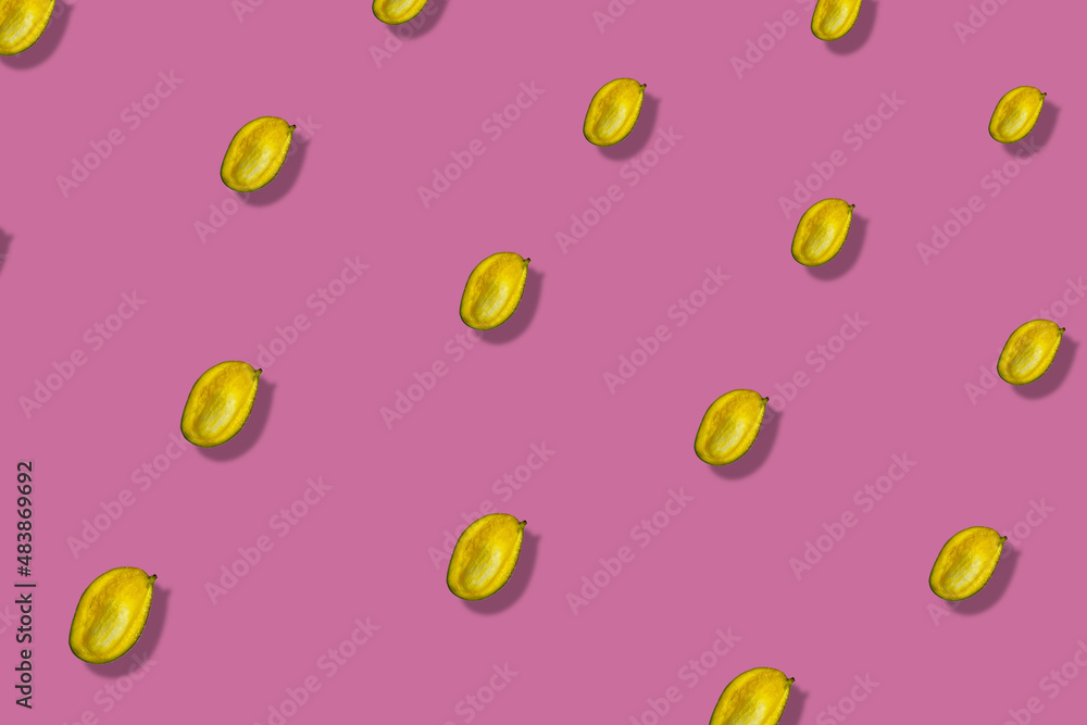 Colorful fruit pattern of fresh mango on pink background with shadows. Top view. Flat lay. Pop art design
