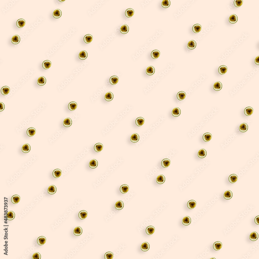 Colorful fruit pattern of fresh passion fruit on light orange background. Top view. Flat lay. Pop art design