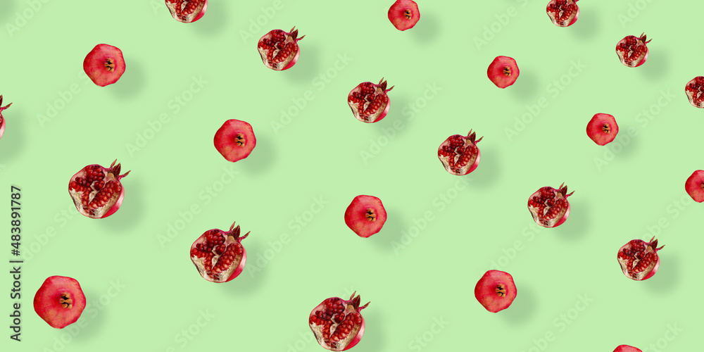 Colorful fruit pattern of fresh pomegranates on light green background. Top view. Flat lay. Pop art design