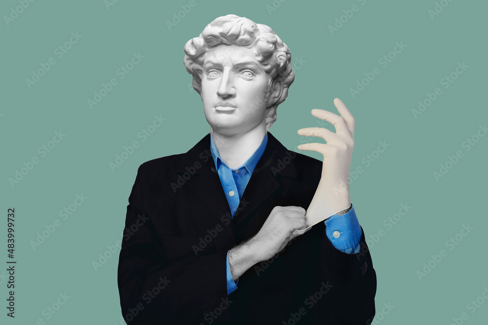Abstract modern collage. The man with the plaster head of David in suit and blue shirt puts on medical glove on blue background