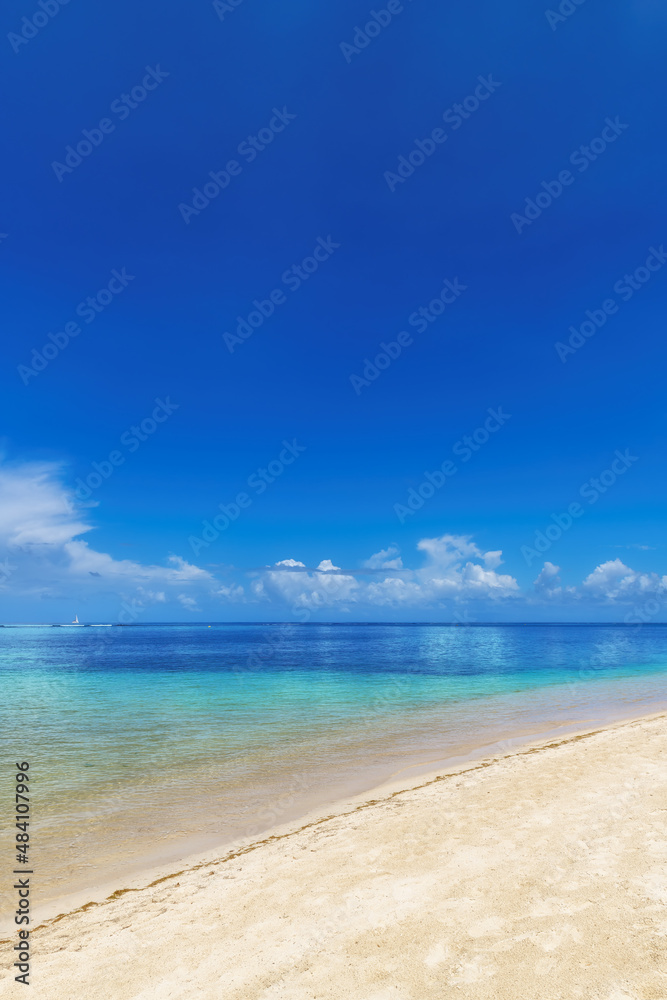 Tropical white sand beach, blue sky and the turquoise sea on Caribbean island.