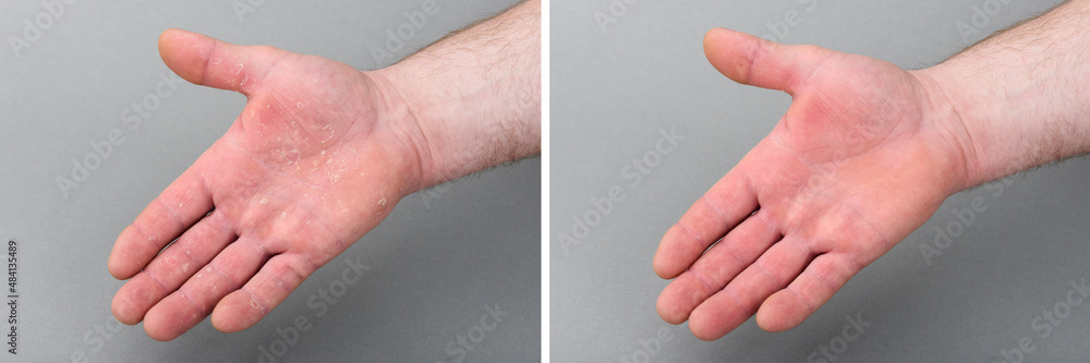 Dry man's hand with skin peeling off. Before and after eczema dermatitis treatment.