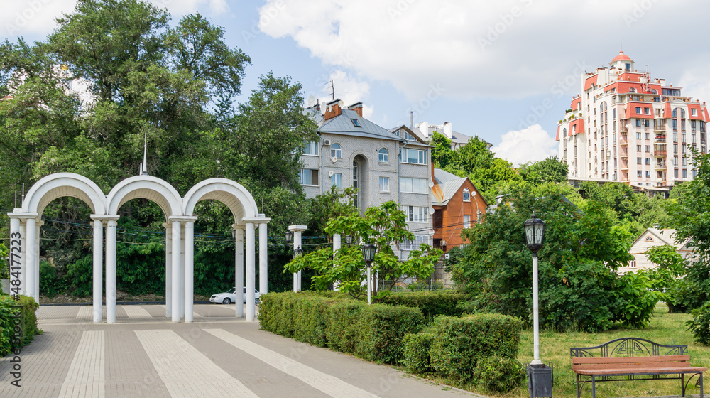 View of Voronezh from Admiralty Square embankment. White arch. Modern and old buildings. Voronezh, Russia - June 17, 2019
