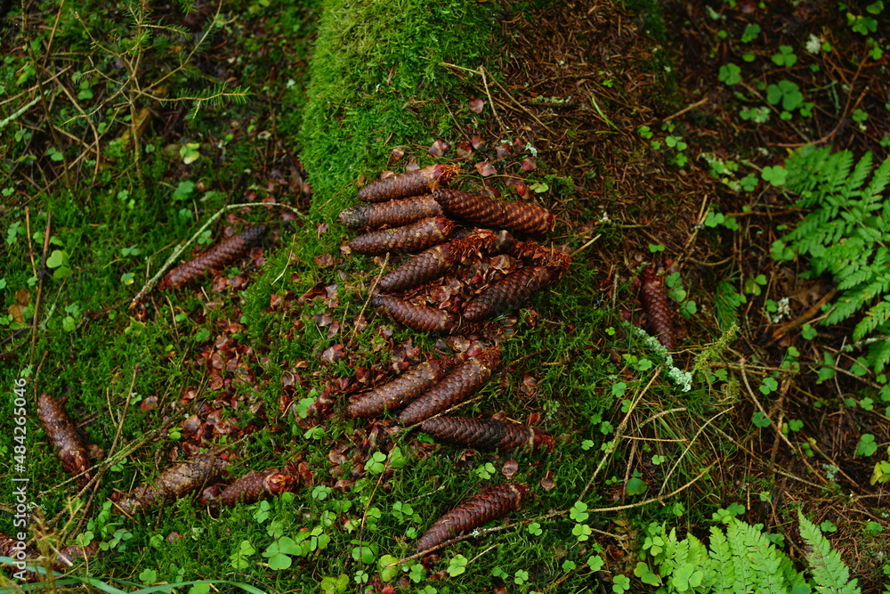 Herbst in einem Wald mit Resten von abgenagten Tannenzapfen, an denen ein Eichhörnchen genagt hat, Sauerland und Ebbegebirge in rotbraun und grün