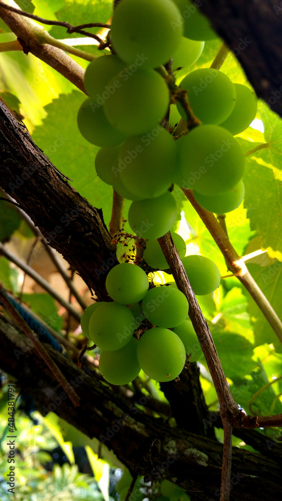 Grapes with green leaves on the vine. fresh fruit in the morning sun