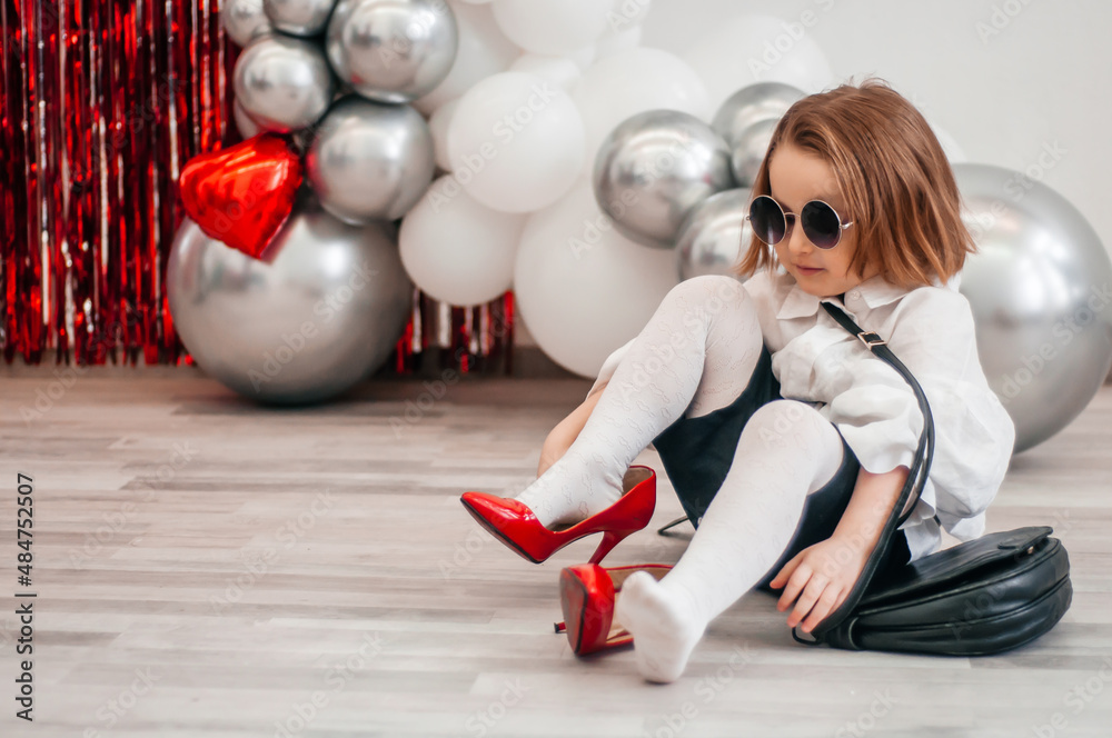 A fashionable baby in sunglasses is trying on her mom's red shoes. Fashion and modern clothes. Glitter bright metallic mirror background, new trends valentine's day