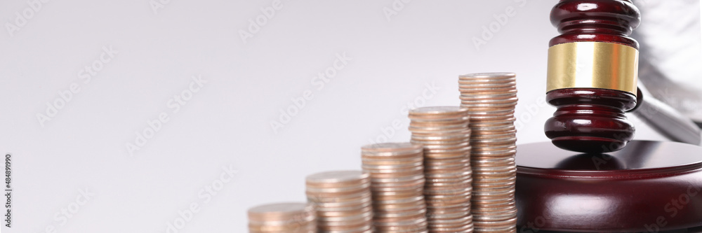 Judge wooden gavel lying near piles of coins in ascending order closeup
