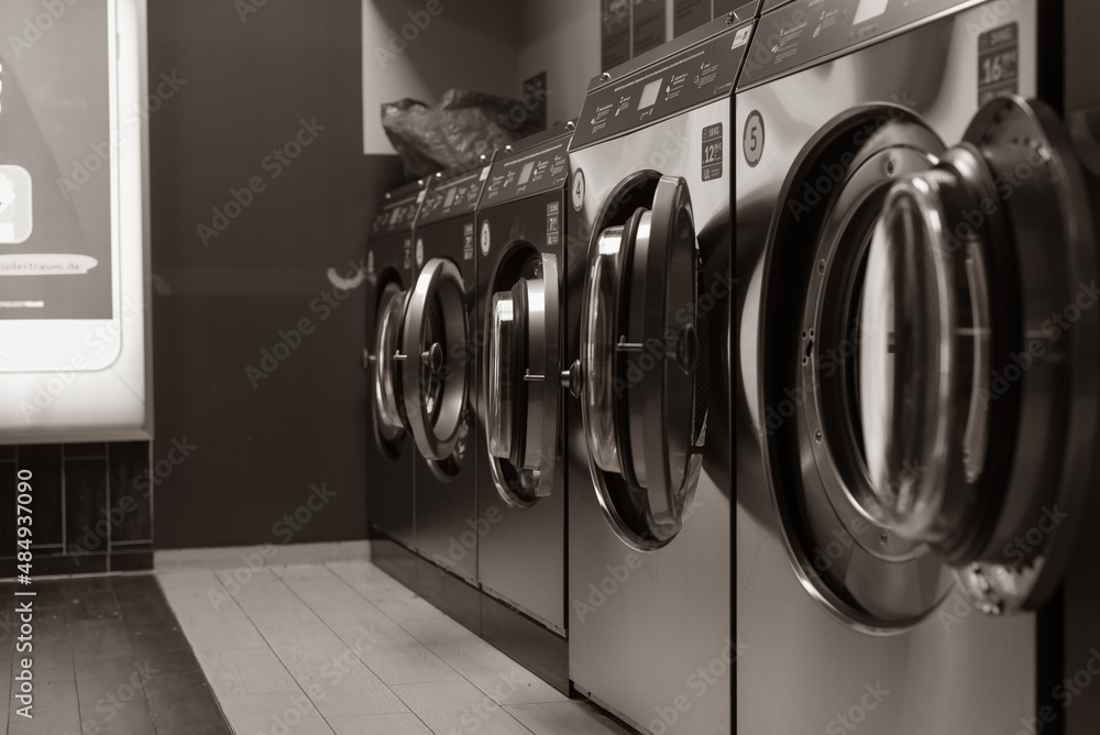 Laundromat inside in the evening, washing machines in a laundromat, black and white photo