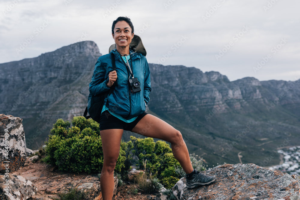 Fit woman in sports clothes holding backpack on a top of a mountain. Female hiker relaxing and looking away after climbing.
