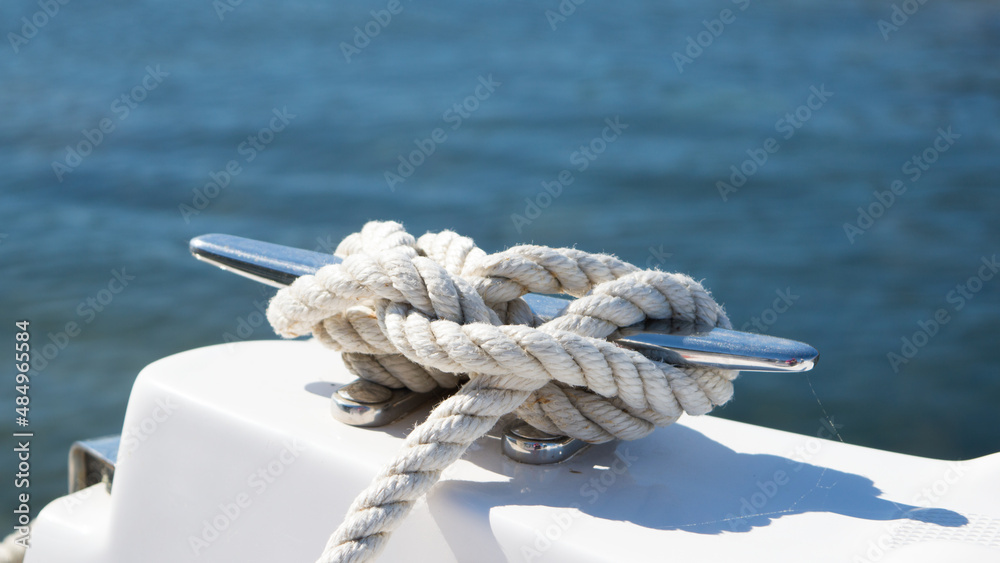 Tight knot on a steel cleat of a boat, detail of tied nautical rope
